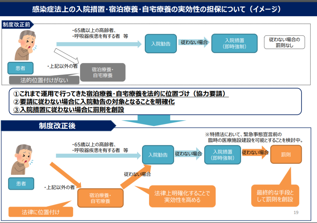 入院拒否等に対する刑罰を盛り込んだ政府の改正感染症法案は、その後、与野党協議を経て行政罰へと修正され、2月3日に成立、13日から施行されるに至った。
