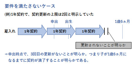 「子が1歳6ヵ月に達する日までに労働契約が満了することが明らかではない」という表現が少しわかりにくいので具体的にどういう状態か見ていきましょう。この点は改正前から変更ありませんが、判断のポイントは以下のとおりです。