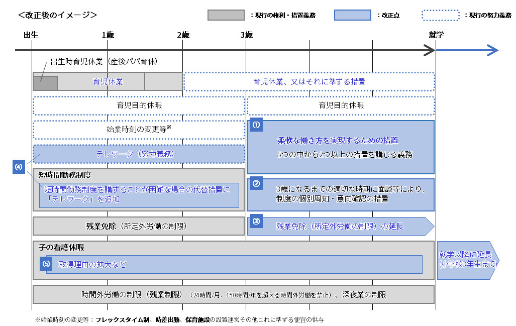 現行法では、3歳から小学校就学前までの期間に努力義務として、フレックスタイム制や所定外労働の免除などいくつかの選択肢から実施可能な措置を講じるよう企業に求めています。改正後は、この措置が努力義務ではなく「義務」化されます。