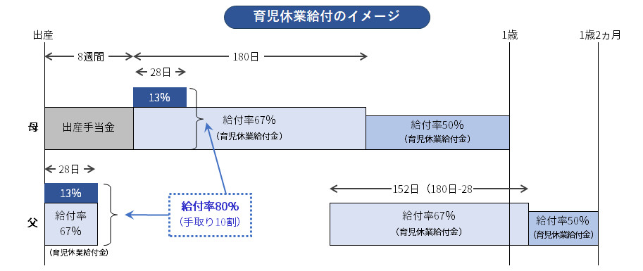 これにより、育児休業給付とあわせて67%+13%=給付率80%(手取り額で10割相当)へ引き上げられるというものです。