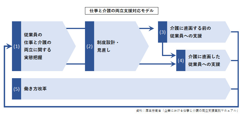 概要としては、(1)従業員の介護の実態把握、(2)制度設計・見直し、(3)介護に直面する前の支援、(4)介護に直面した後の支援、(5)働き方改革、これらのステップを繰り返していくよう促しています(図参照)
