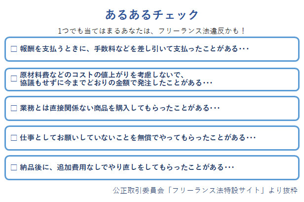 公正取引委員会の「フリーランス法特設サイト」では、ポイントをまとめた動画や理解度診断、「あるあるチェック」(図参照)などが公開されているので、フリーランスに仕事を依頼している企業の方は一度目を通しておくことをお勧めします。