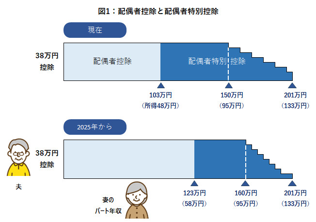これが2025年から図1のように変わります。夫が38万円の配偶者控除を受けられるのは妻の年収123万円までで、160万円までは同じく38万円の配偶者特別控除が適用されます。それを超えると控除額は段階的に減り、201万円を超えると控除がなくなります。