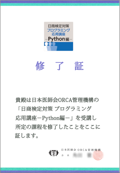 ※ 日商プログラミング検定の修了証とは別のものです。また、検定試験の合格を保証するものではありません。